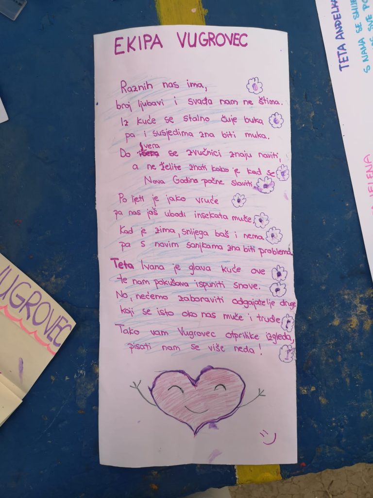 Dodatno smo s djecom crtali, pjevali, igrali i bavili se sportskim aktivnostima, kao podlogom za neslužbeni razgovor s njima, najčešće o njihovim snovima i željama za budućnost, o načinu života u zajednici, o njihovim prijateljskim i bratskim odnosima. Srce nam je puno: dobili smo više nego smo došli dati! Rečenica jednog dječaka za kraj bila je ganutljiv poziv na povratak: „Nemojte nas zaboraviti!“. Nećemo, vidimo se u rujnu!